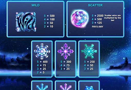 Всі прості піктограми тут представлені 10 різними сніжинками. Складаючи комбінації з 3, 4 і 5 однакових знаків, ви будете отримувати виграші розміром від 5 до 400 ставок. Ще більше справжніх грошей подарує Wild. Він замінює інші картинки, допомагаючи скласти комбінації, і володіє найбільшими коефіцієнтами в автоматі. Його максимальний множник дорівнює 500. У грі з виведенням грошей Burlesque Queen максимальний множник буде таким же.
