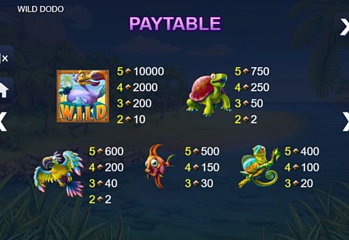 Ігровий апарат Wild Dodo присвячений тропічним тваринам. У цьому автоматі ви будете отримувати реальні гроші, складаючи комбінації на 5 барабанах і 20 лініях. А виведення великих призів забезпечать вільні і повторні обертання.