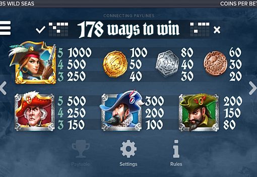 Найменшу прибуток в цьому онлайн слоті приносять різні монети з коефіцієнтами від 20 до 100. Більш щедрі виграші будуть нараховані за капітанів кораблів. За комбінації з ними ви можете отримати реальні призи розміром від 80 до 500 ставок. Але найбільші множники отримала жінка-пірат. Вони рівні 250, 500 і 1000.